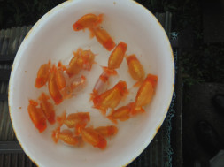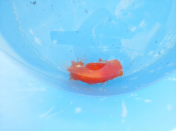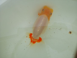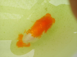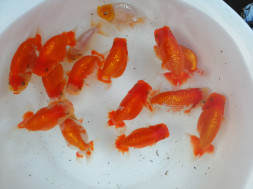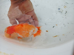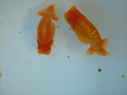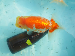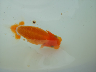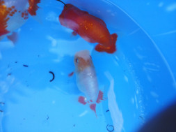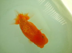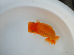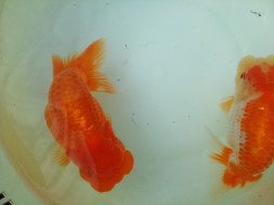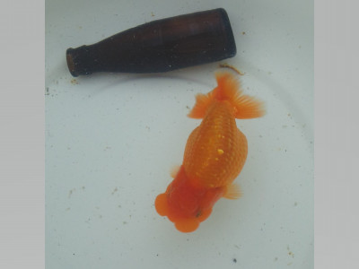 下の左写真のランチュウが約20日間で5cmくらい成長しました(下の右写真)。オロナミンのビンに近づきました。これがランチュウ飼育の醍醐味だと思います。
