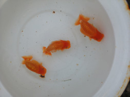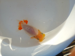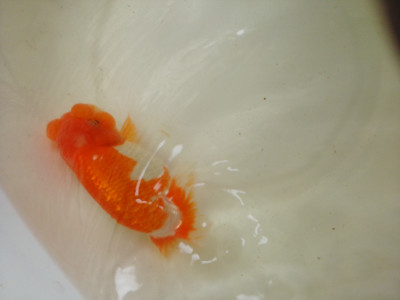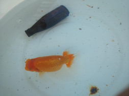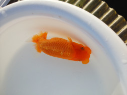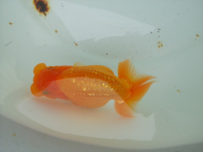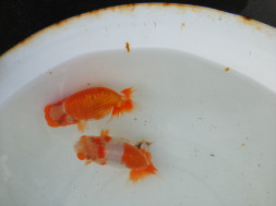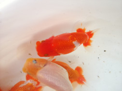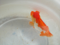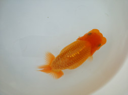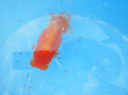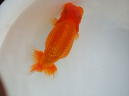 下の左写真のランチュウが約20日間で5cmくらい成長しました(下の右写真)。オロナミンのビンに近づきました。これがランチュウ飼育の醍醐味だと思います。
